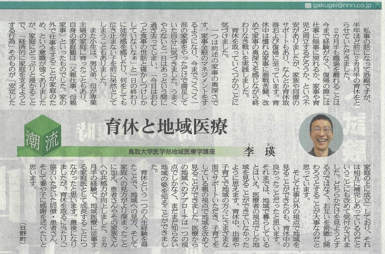 Hey Buddy!, I found this information for you: "日本海新聞 【潮流】に掲載されました。". Here is the website link: https://cbfm.med.tottori-u.ac.jp/blog/20230620lee/. Thank you.