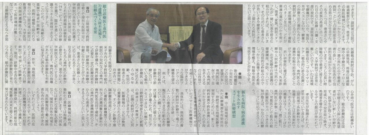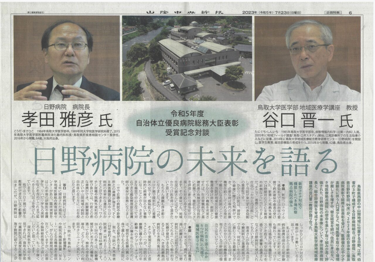 28月 2023 山陰中央新報に、日野病院・孝田院長×地域医療学講座・谷口教授の対談が掲載されました。 2023年7月23日 山陰中央新報 6面 「令和5年度自治体立優良病院総務大臣表彰受賞記念対談」の様子が掲載されました。 (日野病院・孝田院長×地域医療学講座・谷口教授) ~日野病院の未来を語る~ BY tottori-idai-main 0