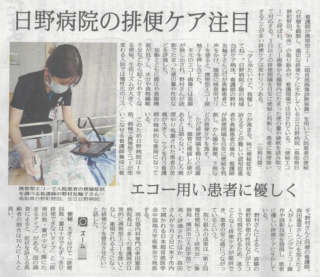 58月 2023 山陰中央新報に日野病院の排便ケア(便秘エコー)の記事が掲載されました 2023年7月24日 山陰中央新報 14面 日野病院で行われている患者にやさしい排便ケア(便秘エコー)の取り組みが掲載されました。 ~日野病院の排便ケア注目~ BY tottori-idai-main 0