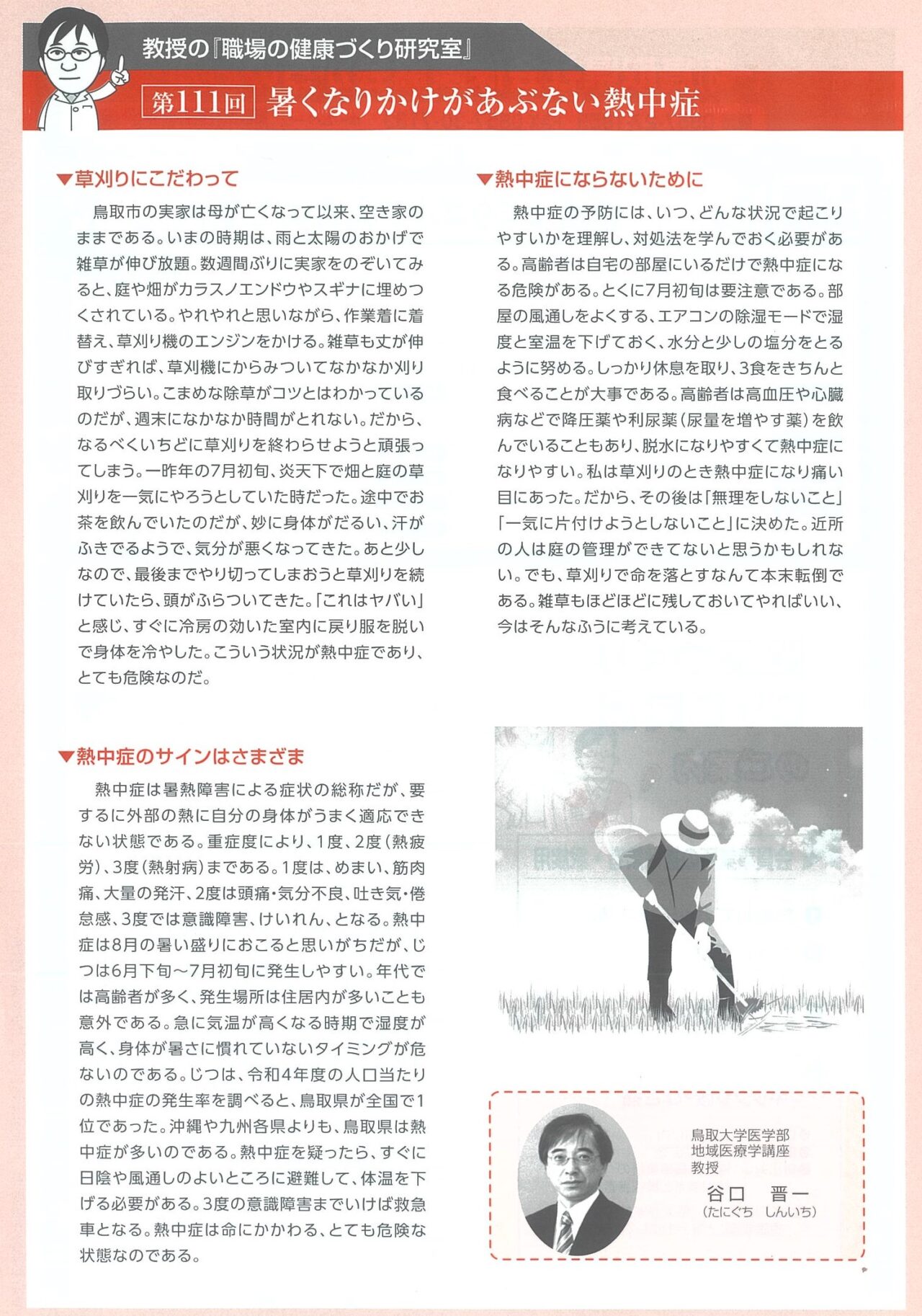 258月 2023 「社会保険とっとり」に掲載されました。 社会保険とっとり Vol.628 2023年8月号 教授の『職場の健康づくり研究室』 第111回 暑くなりかけがあぶない熱中症 BY tottori-idai-main 0