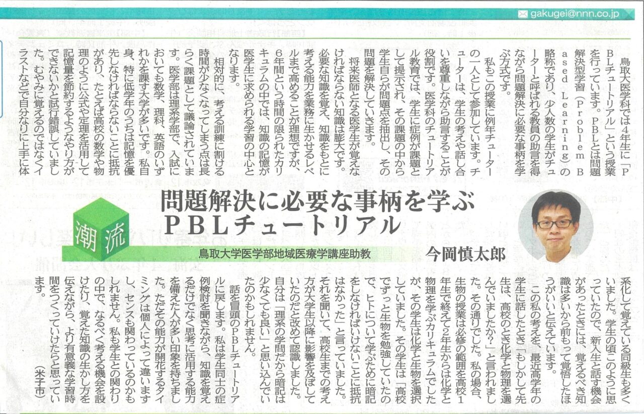 209月 2023 日本海新聞【潮流】に掲載されました。 2023年9月19日 日本海新聞 17面 潮流に掲載されました。 ー問題解決に必要な事柄を学ぶPBLチュートリアルー BY tottori-idai-main 0