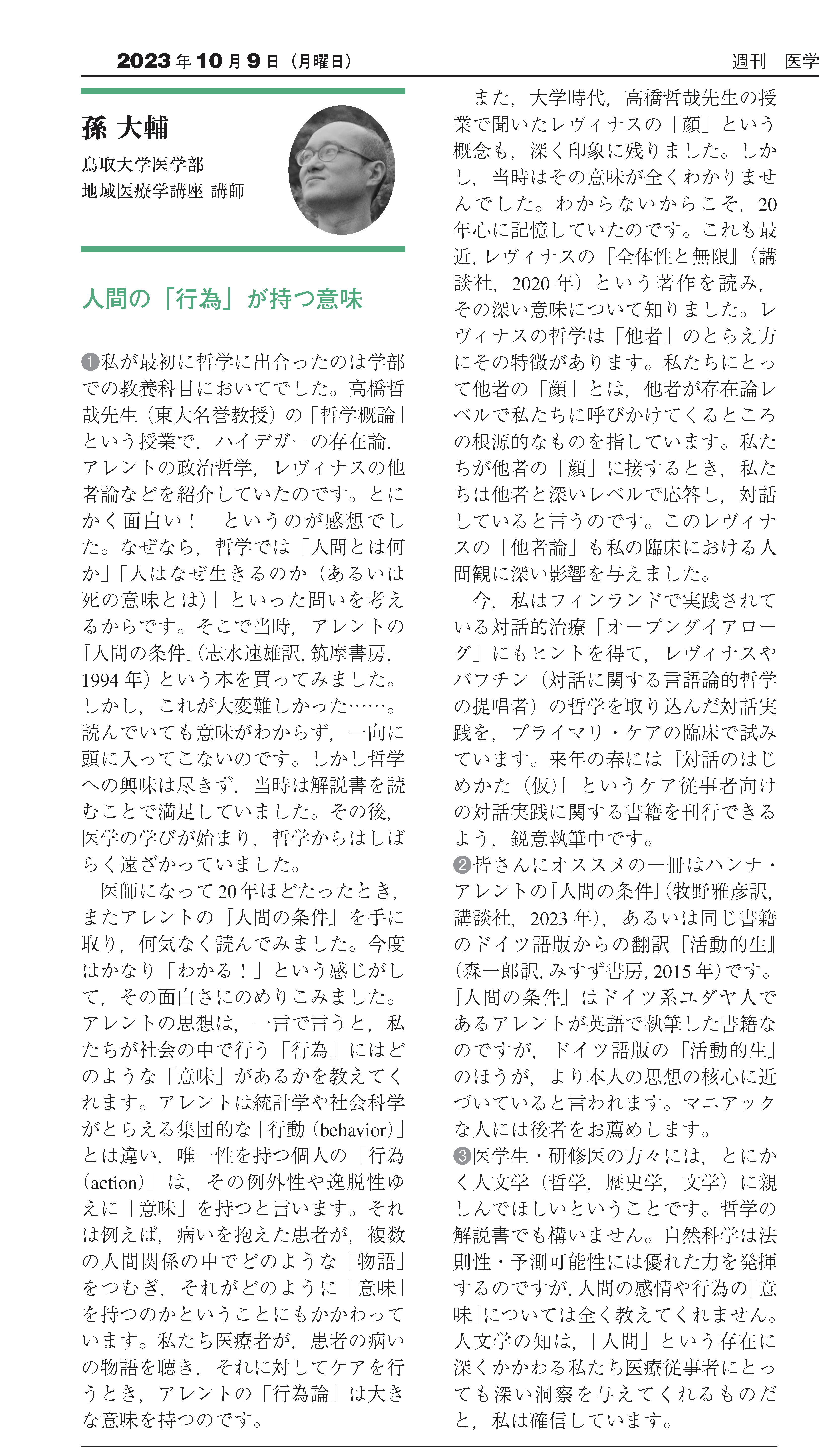 10月9日の週刊医学界新聞の特集「人文・社会科学領域の知と臨床実践の近接するところ」に孫講師の文章が掲載されました。「人間の『行為』が持つ意味」と題して、哲学・人文学に馴染むことが臨床実践にどのような意味を持つのかといった内容です。