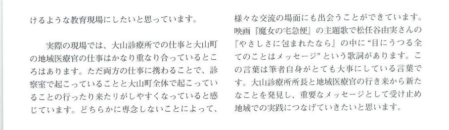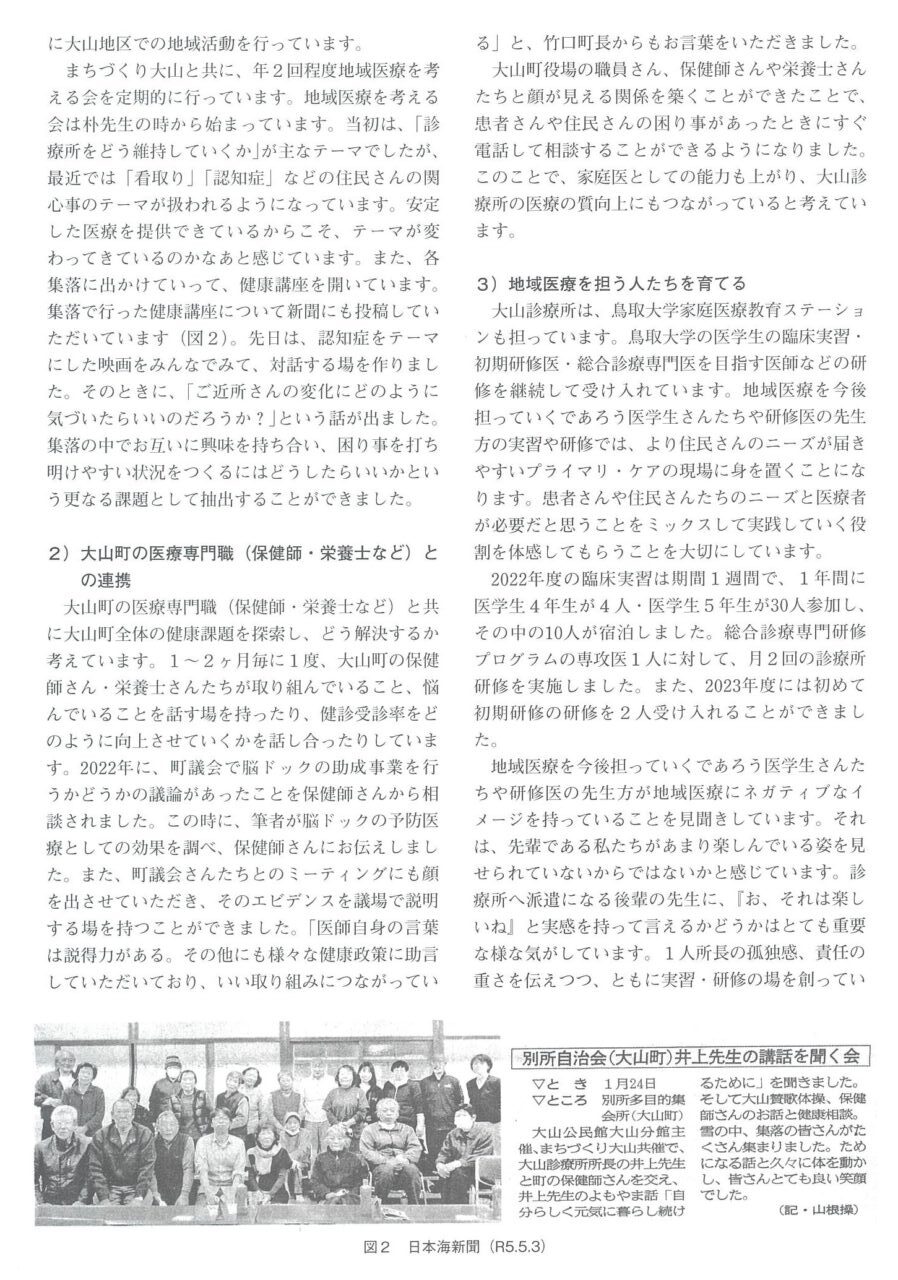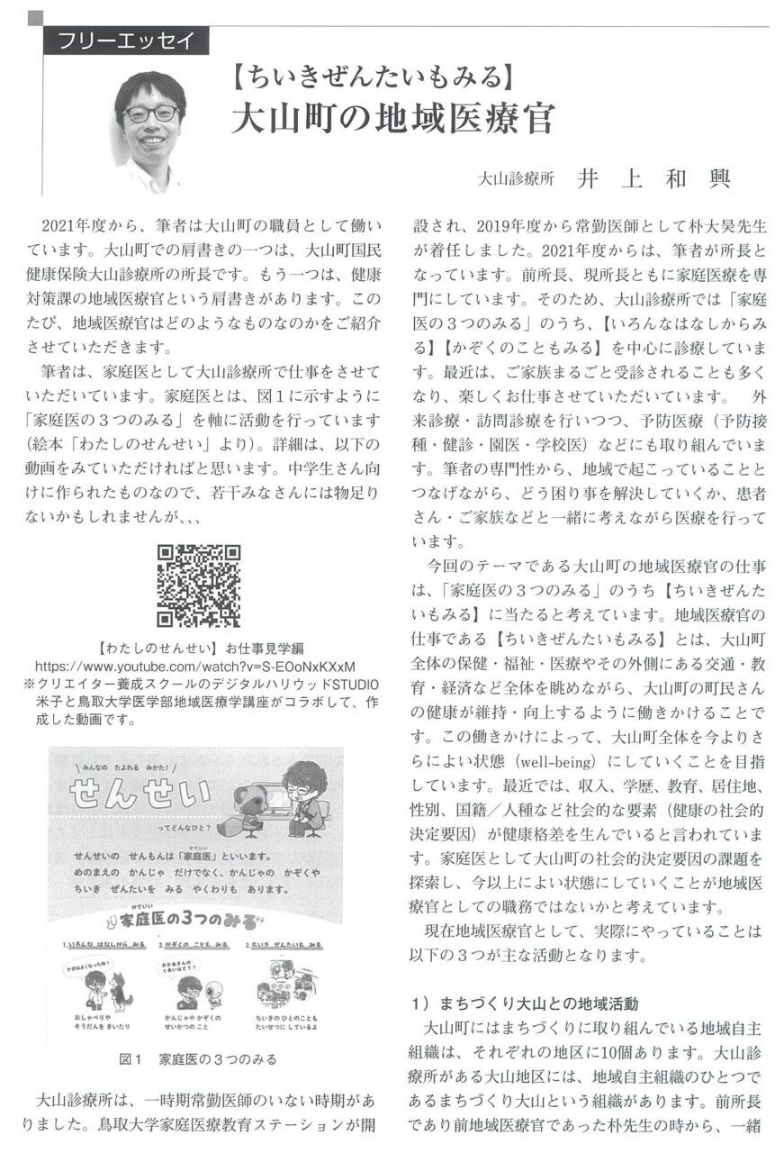 2112月 2023 鳥取県西部医師会報 No.217に掲載されました。 鳥取県西部医師会報 No.217 井上先生の記事が掲載されました。 【ちいきぜんたいもみる】大山町の地域医療官 BY tottori-idai-main 0