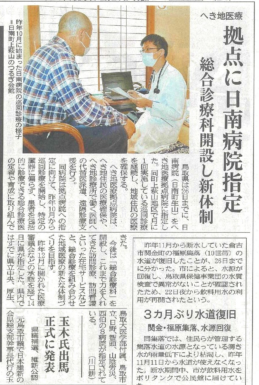 272月 2024 日本海新聞に掲載されました【日南病院へき地医療拠点 総合診療科開設へ】 2024年2月27日 日本海新聞 24面 日南病院がへき地医療拠点病院に指定され、今後は「総合診療科」開設し新体制へ。 (写真は谷口尚平先生の巡回診療の様子) BY tottori-idai-main 0