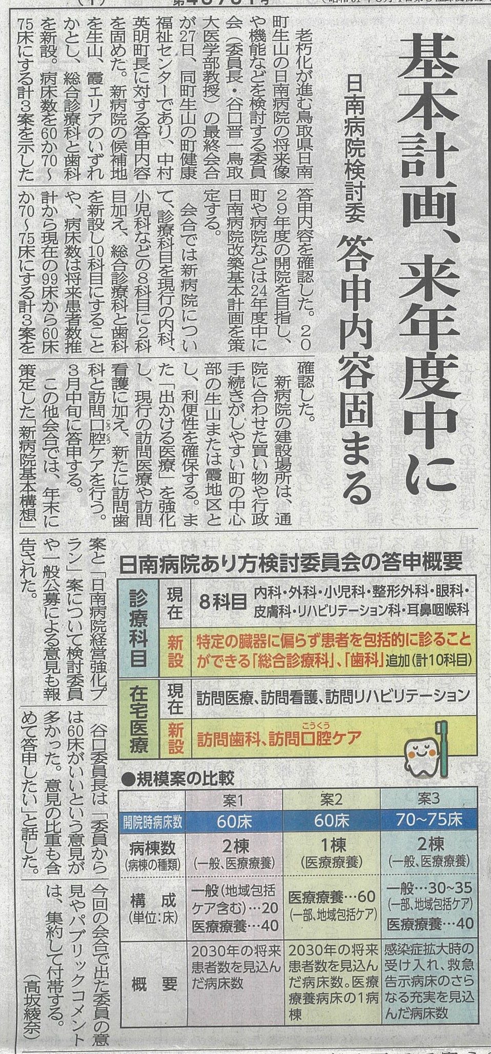 292月 2024 日本海新聞に掲載されました 2024年2月28日 日本海新聞 1面 日南病院の将来像や機能などを検討する委員会の会合が行われ、記事が掲載されました。 (委員長 谷口教授) BY tottori-idai-main 0