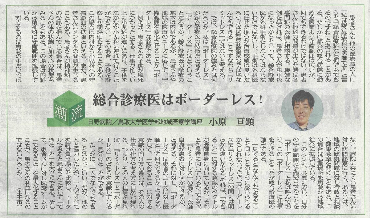 Hey Buddy!, I found this information for you: "日本海新聞【潮流】に掲載されました". Here is the website link: https://cbfm.med.tottori-u.ac.jp/blog/20240620ohara/. Thank you.