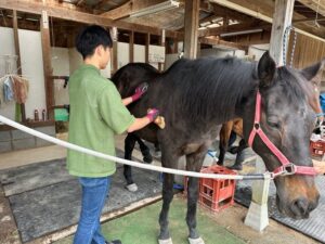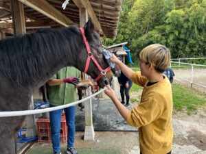 学生たちは、まずは馬房清掃、水桶掃除などから始め、少しずつ馬に触れていきました。ブラッシングなどの馬の手入れ、餌やり体験などを経て、少しずつ馬に慣れていきます。そして引き馬体験をした後に、一部の学生さんは乗馬体験も経験しました。