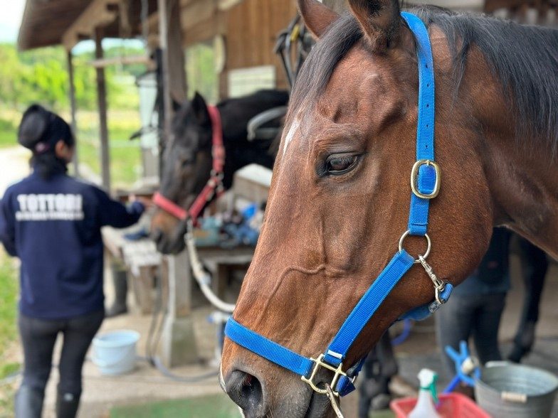 さる5月19日、26日、6月2日に、大山町にある「大山馬野背クラブ」にて馬とふれあう体験を開催しました。大山馬野背クラブには老齢の二頭のお馬さん「ジーン」と「アルフィー」がいます。ジーンは元競走馬で新潟記念(G3)を勝ったことがある重賞馬。あの武豊やデムーロ騎手を背に走ったこともあるという名馬です。アルフィーは乗馬クラブで長い間働き続けたサラブレッドです。母はシンコウラブリィ、父はブライアンズタイムという超良血馬ですが穏やかな性格です。