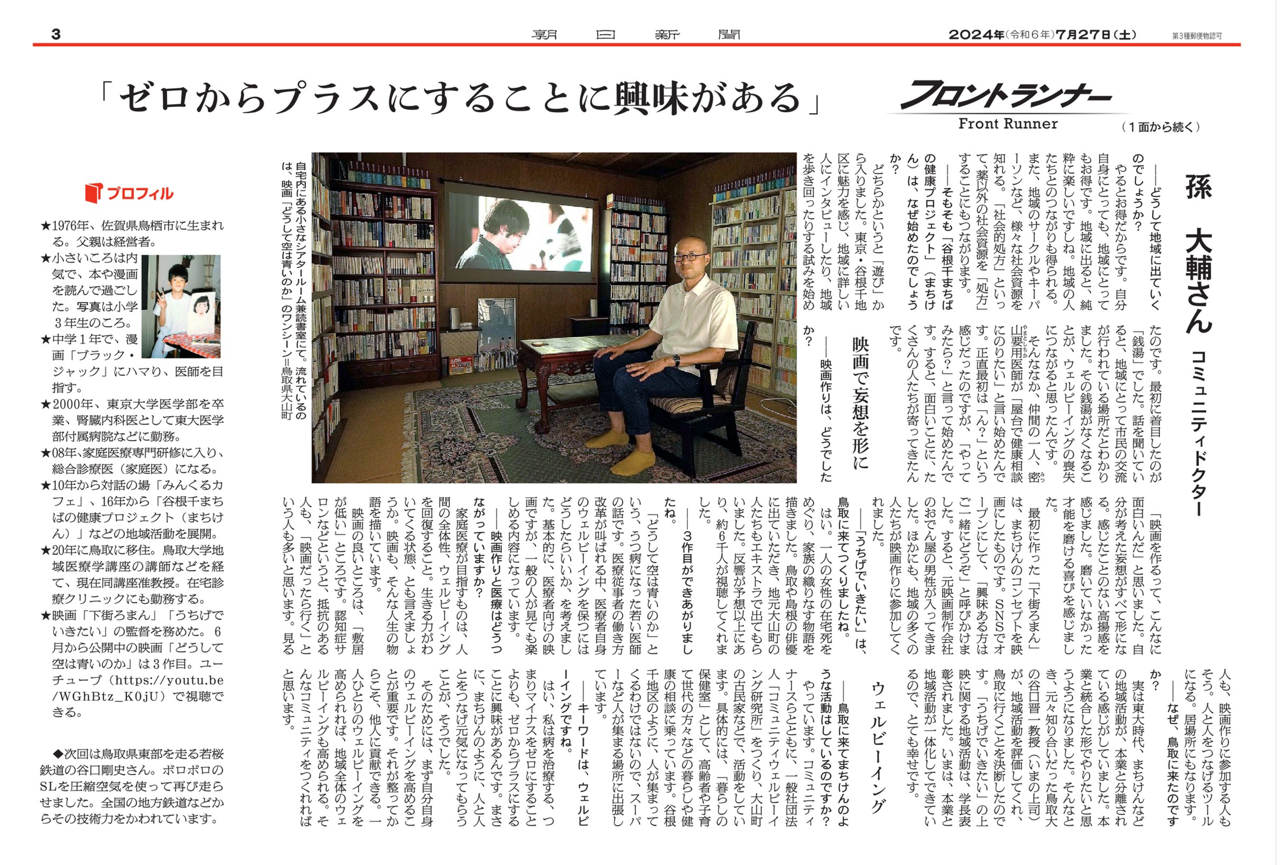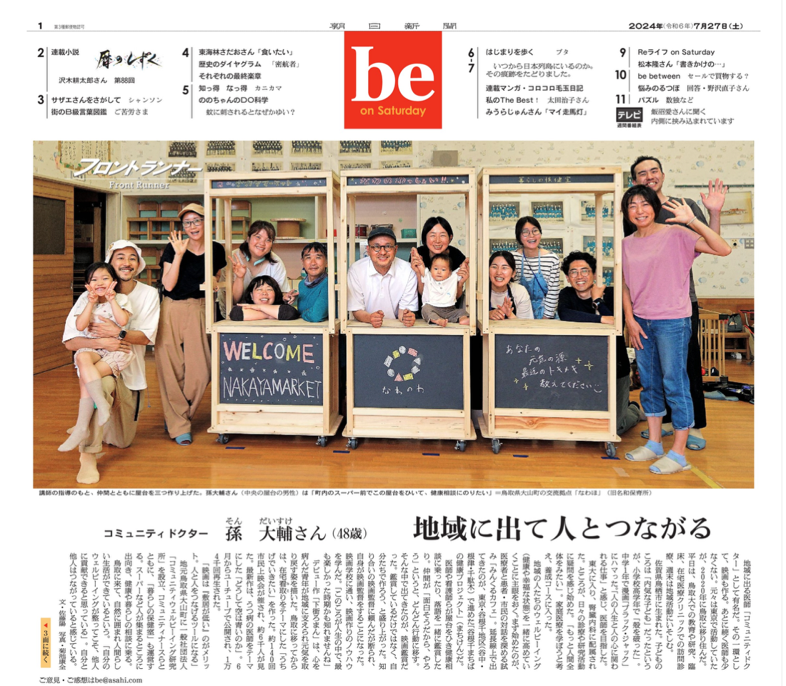297月 2024 朝日新聞に掲載されました。 朝日新聞 be on Saturday 2024年7月27日号 1・3面に孫先生の記事が掲載されました。 ~地域に出て人とつながる~ BY tottori-idai-main 0