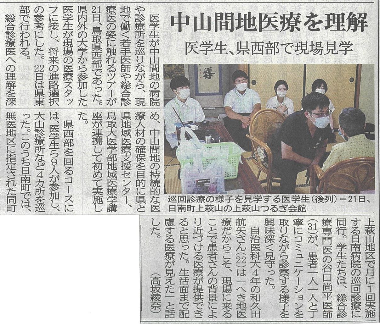 「とっとりの総合診療医と地域医療にふれるツアー」で谷口尚平先生の診察を見学する県内外の医学生の様子が掲載されました。
