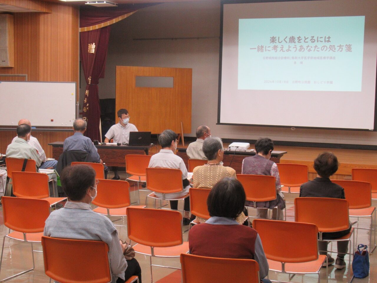2110月 2024 おしどり学園で講演をしてきました 10月18日に日野町の生涯学習の場であるおしどり学園で「楽しく歳をとるには 一緒に考えようあなたの処方箋」というテーマでお話をさせていただきました。 昨年度に続いて今年度も小生が担当し、健康長寿のための12か条(東京都健康長寿医療センター研究所による)を参考にしながら、エビデンスに基づいた健康長寿のための行動について皆さんにお話をさせていただきました。 外来で担当させてもらっている患者さんもご参加いただき、普段外来の場ではお話できないような内容もお伝えできたのではないかと思います。 引き続き、地域の方の健康増進のための取り組みを続けていこうと思います。(李) BY tottori-idai-main 0
