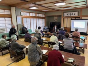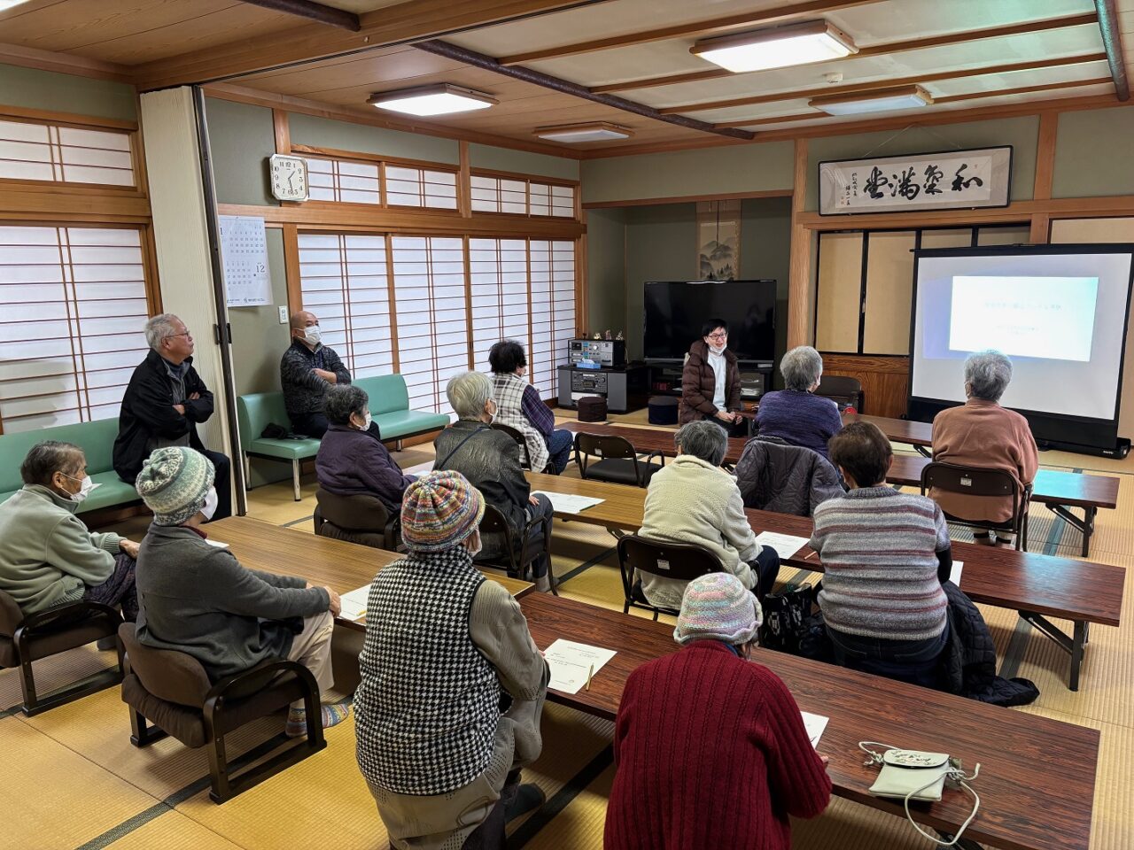 1312月 2024 健康教室を開催しました 先日、日野町の下榎地区で健康教室を開催しました。テーマは「フレイル」です。最近普及してきた「フレイル」ということば、またフレイル予防の考え方についてお話しさせていただきました。健康教室後には、参加者の皆様と茶話会を行い、皆様の日々の生活や、健康に関する疑問など多くのお話を伺うことができました。下榎地区の皆様には、お寒い中ご参加いただき、あらためて感謝申し上げます。今後も住民の皆様とこのような交流の場を持てれば、と思っております。(今岡) BY tottori-idai-main 0