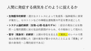 2024年度に新たに開講した1年生向けの選択授業「医学・医療に役立つ人文科学の知」の報告です。教養科目の一貫として、谷口教授と私で新たに開講しました。具体的にはジャン=ジャック・ルソー、カール・マルクス、マルティン・ハイデガー、ハンナ・アレント、エーリッヒ・フロム、ミシェル・フーコー、西田幾多郎、宇沢弘文、スピノザという9人に哲学者・思想家などを取り上げました。毎回1人の思想家について、学生に主要概念についてまとめてきてもらい発表してもらいます。例えば、ルソーなら「自然とは何か」、ハイデガーなら「世界内存在とは何か」という形です。その後、こちらで臨床事例を提示します。事例は慢性疾患を抱える患者の事例や、「ワクチンを打ちたくない」というワクチン忌避の事例、ときに映画の一部を見て考えるシネメデュケーションを行いました。