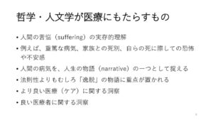 さまざまな哲学者や思想家の考えたことが今でも決して古びておらず、私たちの目の前の問題に適応させて考えることができること、またこうした人文科学の知こそが、現代医療における難しい問題(技術発展と生命延長、医療のゴールの変化、公平な医療とは、等)を考える上では不可欠のものとなることなどを、学生は感じてくれたように思います。来年度も同じ授業を続けていきたいと思います。