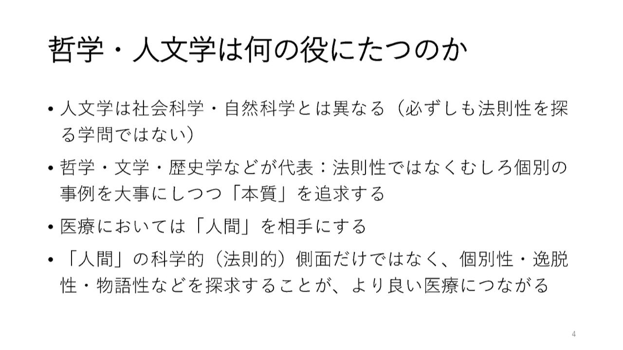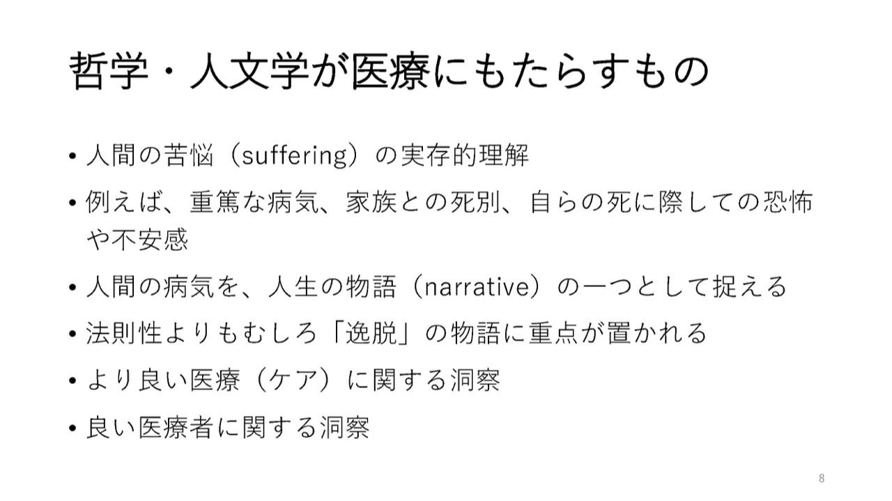 さまざまな哲学者や思想家の考えたことが今でも決して古びておらず、私たちの目の前の問題に適応させて考えることができること、またこうした人文科学の知こそが、現代医療における難しい問題(技術発展と生命延長、医療のゴールの変化、公平な医療とは、等)を考える上では不可欠のものとなることなどを、学生は感じてくれたように思います。来年度も同じ授業を続けていきたいと思います。