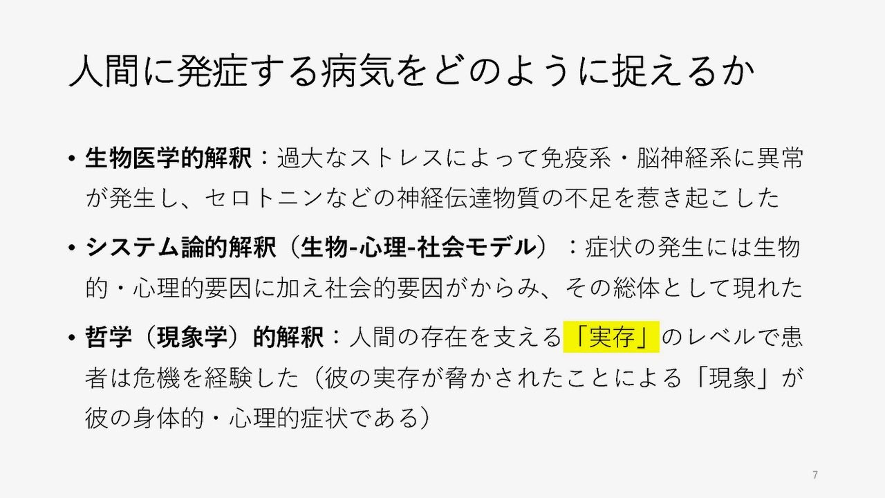 2024年度に新たに開講した1年生向けの選択授業「医学・医療に役立つ人文科学の知」の報告です。教養科目の一貫として、谷口教授と私で新たに開講しました。具体的にはジャン=ジャック・ルソー、カール・マルクス、マルティン・ハイデガー、ハンナ・アレント、エーリッヒ・フロム、ミシェル・フーコー、西田幾多郎、宇沢弘文、スピノザという9人に哲学者・思想家などを取り上げました。毎回1人の思想家について、学生に主要概念についてまとめてきてもらい発表してもらいます。例えば、ルソーなら「自然とは何か」、ハイデガーなら「世界内存在とは何か」という形です。その後、こちらで臨床事例を提示します。事例は慢性疾患を抱える患者の事例や、「ワクチンを打ちたくない」というワクチン忌避の事例、ときに映画の一部を見て考えるシネメデュケーションを行いました。