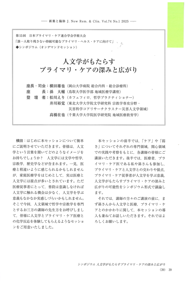 『新薬と臨床』誌に論考「人文学がもたらすプライマリ・ケアの深みと広がり」が掲載されました