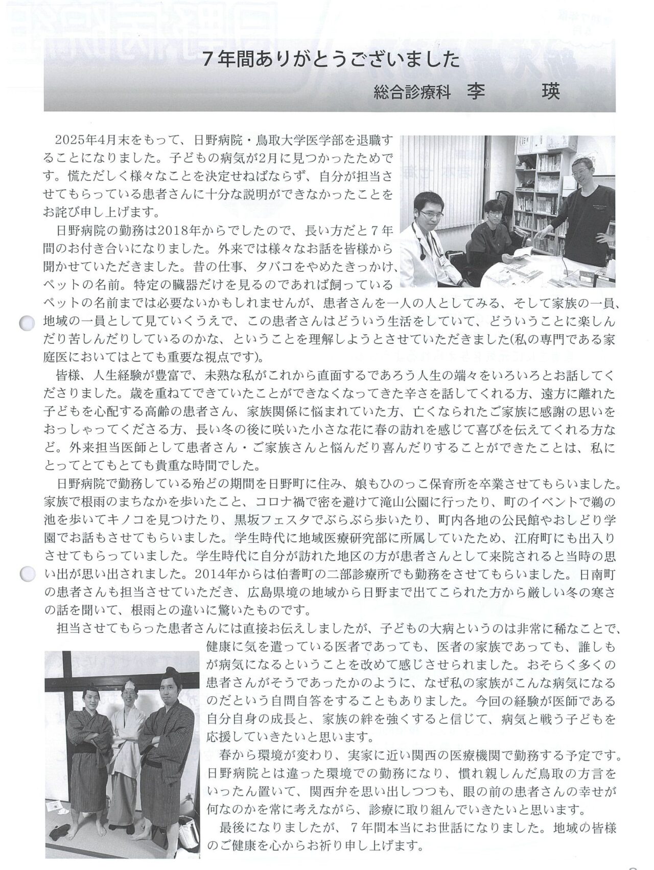 155月 2025 日野病院組合だより『せせらぎ』に掲載されました 日野病院組合だより『せせらぎ』No.83に、奥谷先生の紹介と李先生の退任の挨拶が掲載されました。 BY tottori-idai-main 0
