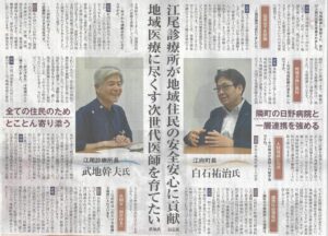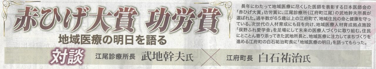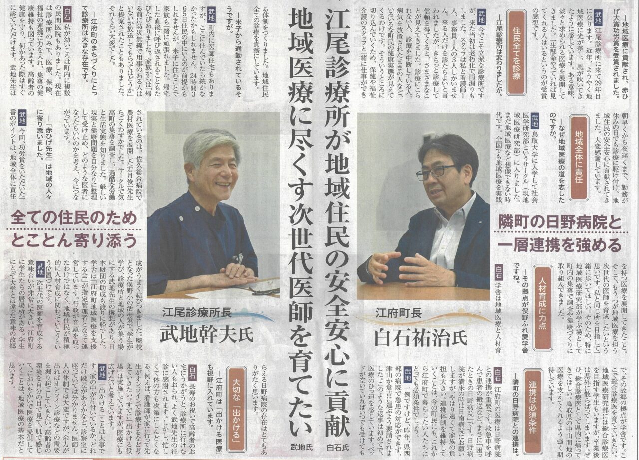 88月 2025 日本海新聞に、江尾診療所・武地所長×江府町・白石町長の対談が掲載されました。 2025年7月30日 日本海新聞 22面 「赤ひげ大賞 功労賞」に江尾診療所の武地幹夫所長が選ばれました。 武地所長と江府町の白石祐治町長の対談の様子が掲載されています。 ~地域医療の明日を語る~ BY tottori-idai-main 0