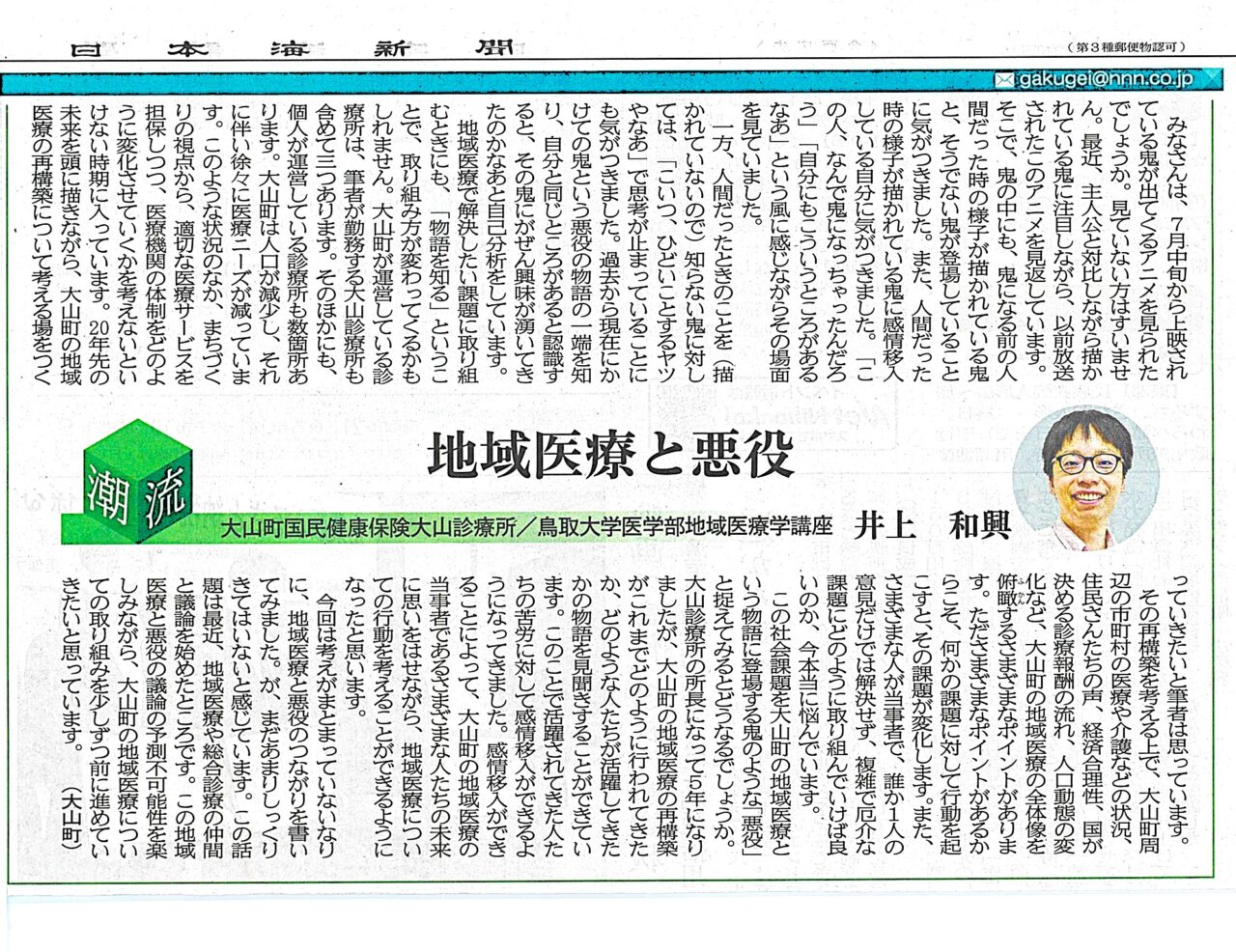 Hey Buddy!, I found this information for you: "日本海新聞【潮流】に掲載されました". Here is the website link: https://cbfm.med.tottori-u.ac.jp/blog/20250918inoue/. Thank you.