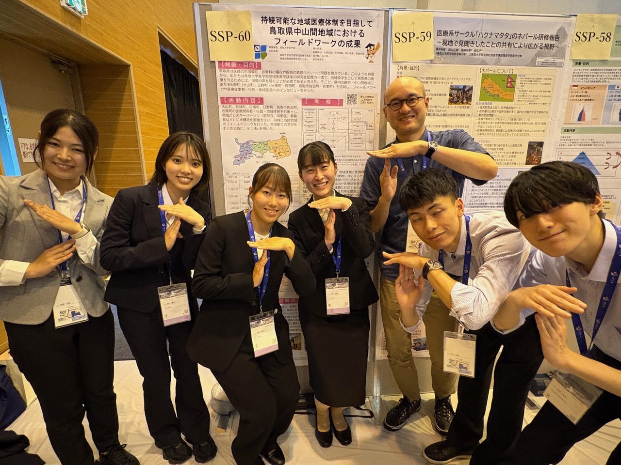 学会期間中は全国から家庭医、総合診療医、学生、研修医が集まり、多彩な発表や議論が繰り広げられました。鳥取大学地域医療学講座からもいくつかの発表を行い、特に地域枠学生によるポスター発表は注目を集めました。演題は「持続可能な地域医療体制を目指して:鳥取県中山間地域におけるフィールドワークの成果」で、県内6つの地域を訪問し、医療従事者や住民へのインタビューから課題と強みを明らかにしたものです。人口減少や人材不足、高齢化といった共通課題に加え、地域コミュニティの結束力や多職種連携の強さといったポジティブな側面も描き出されました。学生たちはKJ法を用いた分析を通じて「ジェネラルマインドの普及」「医療DXの推進」「地域の魅力発信」などの具体的な提言をまとめ、聴衆に大きな刺激を与えました。若い世代が現場の声に耳を傾け、自らの言葉で地域医療の未来を語る姿に大きな希望を感じました。