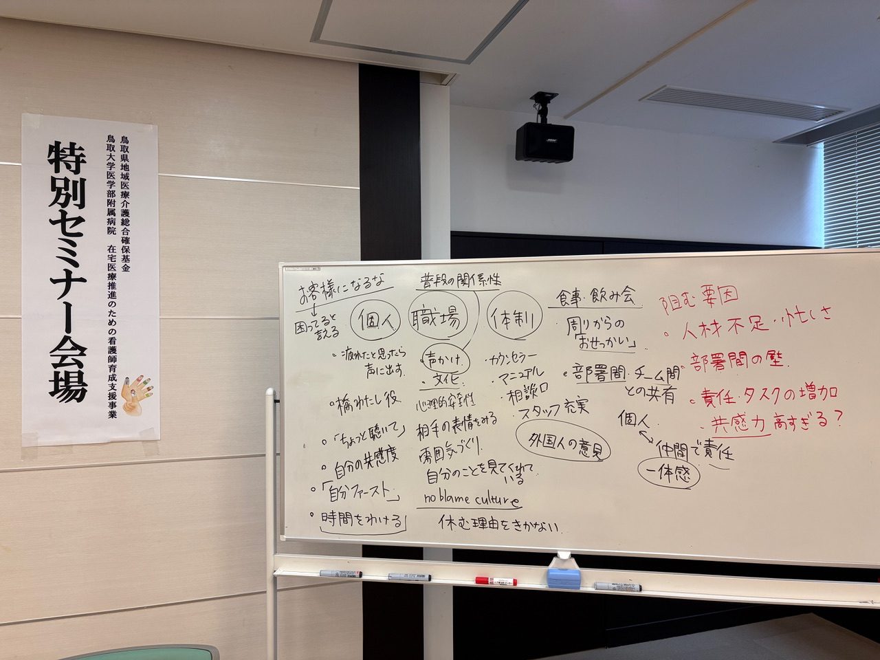 9月28日、倉吉市の鳥取県立厚生病院で開催された第16回T-HOC特別セミナーにて、講師を務めました。今回のテーマは「在宅ケアにおける共感とwell-being~自分のwell-beingは考えていますか?~」。午前中はシンポジウムとして、私を含むシンポジストがそれぞれの立場から在宅ケアにおける共感の意義と難しさ、そして医療者自身のwell-beingをどう守るかについて発表しました。