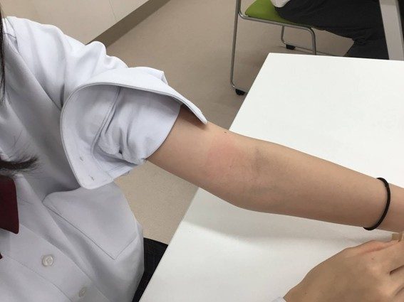 またアルコールパッチテストをみんなで行い、アルコールにどのくらい強いか調べました。将来的に飲酒するにあたって、どのくらい酒に強いかを事前に知っておくことは非常に参考になります。