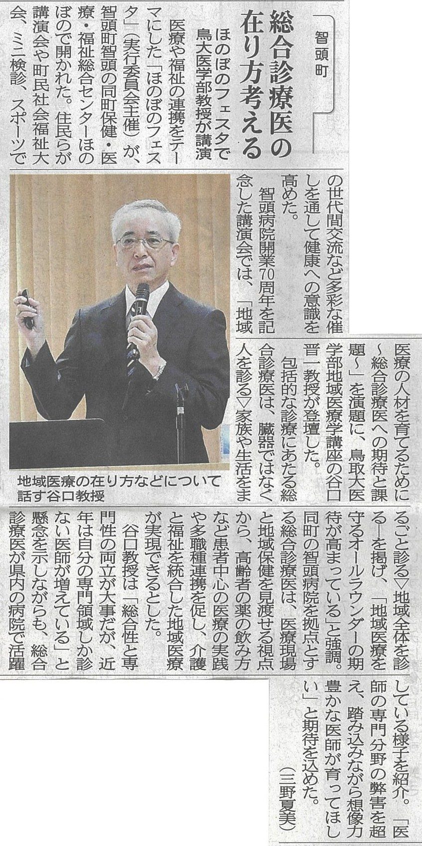 1311月 2025 日本海新聞に掲載されました【総合診療医の在り方考える】 2025年11月1日 日本海新聞 22面に掲載 智頭町にて「ほのぼのフェスタ」が開催され、谷口教授が登壇しました。 BY tottori-idai-main 0