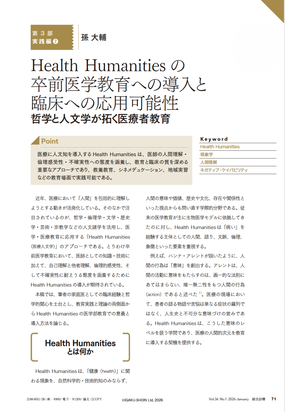 孫大輔. Health Humanitiesの卒前医学教育への導入と臨床への応用可能性—哲学と人文学が拓く医療者教育. 総合診療, 36(1): 71-75, 2026.
