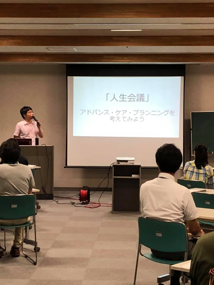 「7月17日(水)に「人生会議–アドバンス・ケア・プランニングを考えてみよう–」と題して,日野病院でワークショップを行いました.日野町内の保健・福祉・医療の関係職種の方々と一緒に話し合いながら,企画を練って,当日を迎えました.当日は,日野郡内の保健・福祉・医療の関係職種のほか,救急隊の方や日野病院に丁度実習に来ていた学生さんたちも参加してくださいました.内容は,①アドバンス・ケア・プランニングを説明した動画を見ながら質問を考える,②症例検討,という構成でした.いろいろな職種の方が集まり,お互いに考えをぶつけることで,「普段使わない言葉を使って考えを伝えないといけないという状態が起こり,気づきがあったなあ」という感想をくれた方もいました.今回企画ししていく中で,「HACP(日野アドバンス・ケア・プランニング)を作りたい!」という気運も高まってきたので,3ヶ月後ぐらいに第2弾をする予定になりました!そのときは,またよろしくおねがいしますー^^」(井上