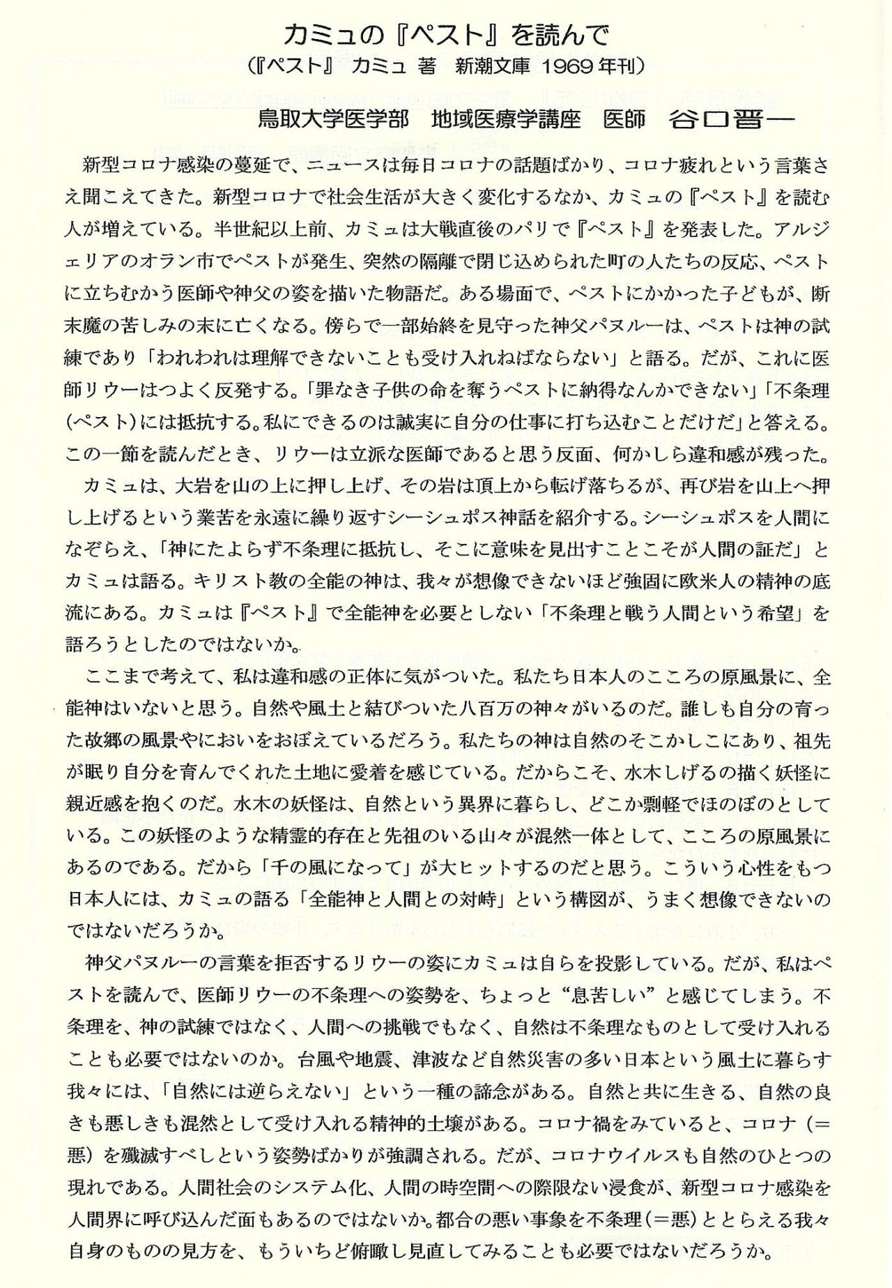 196月 2020 Book&Life第42号『特集”紙上トークⅡ!私のおすすめの一冊”』に寄稿しました 本の学校生涯読書をすすめる会発行のBook&Life第42号『特集”紙上トークⅡ!私のおすすめの一冊”』に寄稿しました。 カミュの『ペスト』を読んで 谷口 晋一 BY tottori-idai-main 0