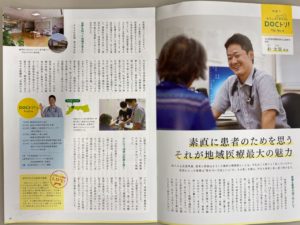 1911月 2020 DOCトリに特集していただきました! DOCトリは鳥取県地域医療支援センターの広報誌で、鳥取県内の地域医療機関を取り上げて特集していますが、今回大山診療所を特集してくれました! 大山が雲に隠れていた日だったので、反対側を向いて海をバックに写真撮影しました。 職員たちは写真に写りたがらず、撮影後は写真の加工を求められましたが、あるがままの姿ということでそのまま掲載してもらいました! (朴) BY tottori-idai-main 0