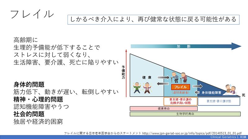 フレイル(frail)とは健常から要介護に移る間の状態を言います。