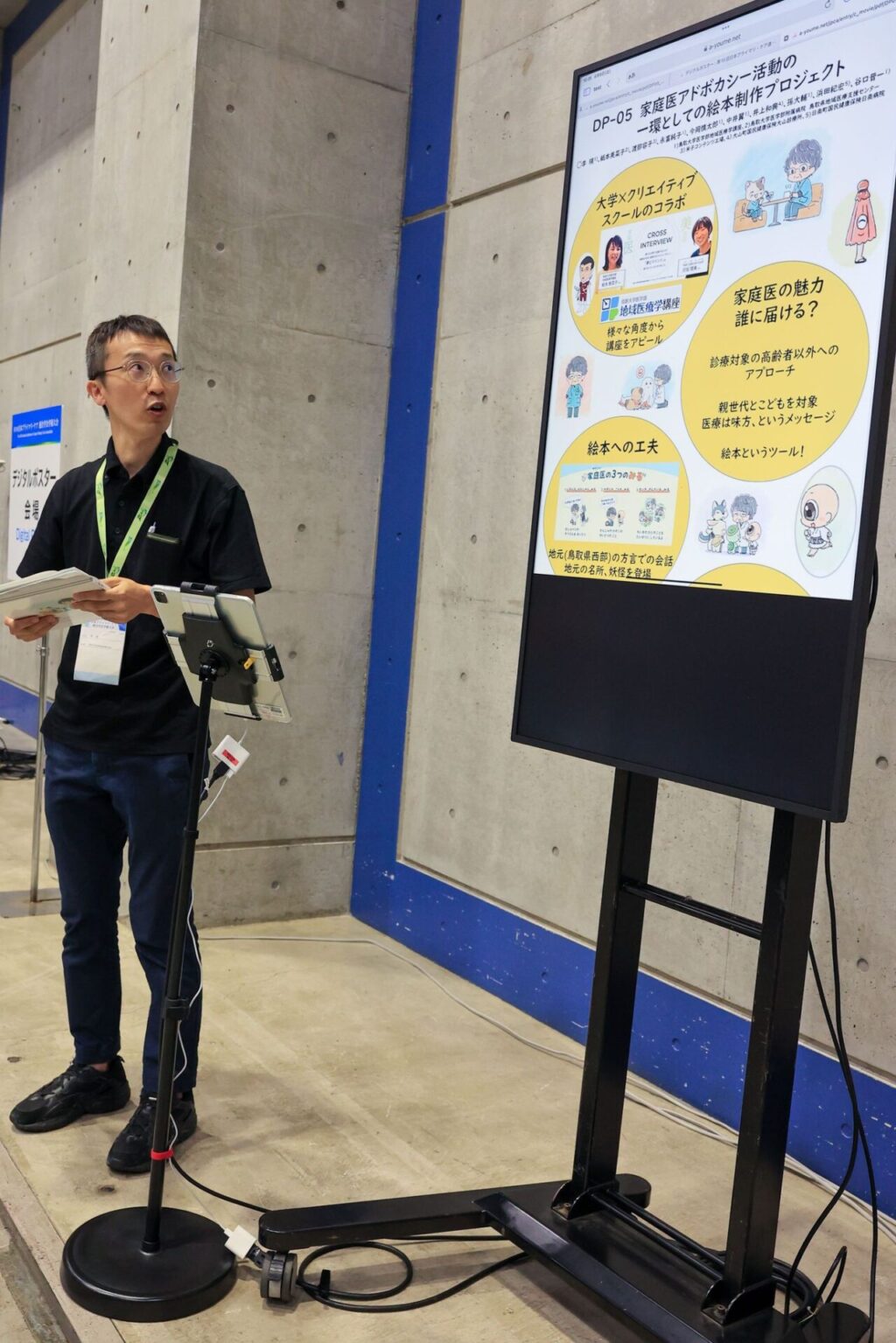 活動報告や研究発表の発表もありました。小生も、以前当講座で取り組んだ絵本に関する活動報告をデジタルポスターで発表しました。デジタルポスターはその名の通り、デジタルモニターに発表スライド(pdf)を提示したうえでプレゼンテーションを行います。