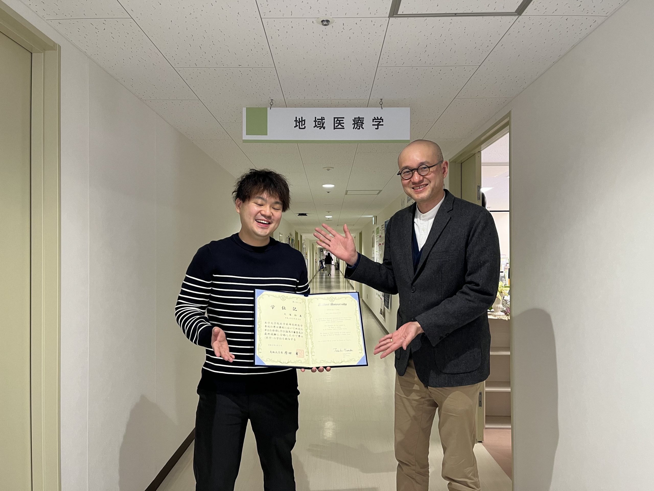 医学博士(地域医療学)となります。学位取得は当講座で2人目ということで、この気持ちを胸に引き続き研究にも邁進しようと思います。皆様の温かいご支援、ありがとうございます!(大塚裕眞)