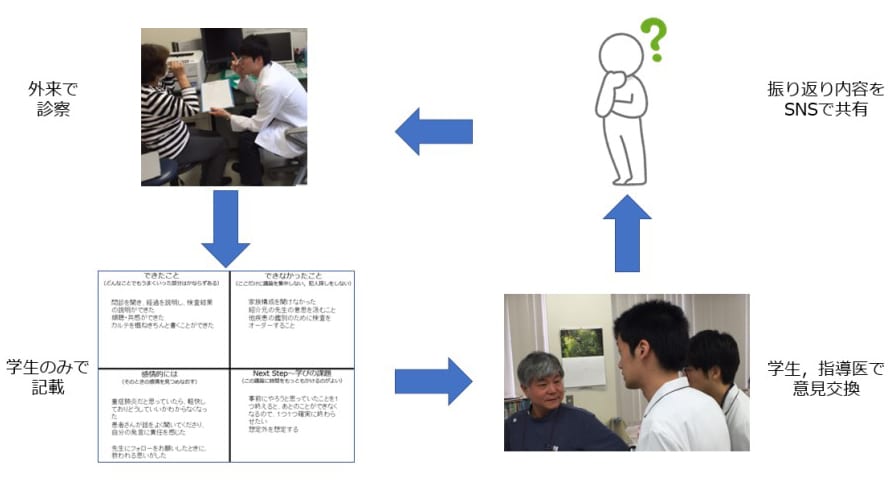 その中で、もやもやすることがたくさんうまれます。そのもやもやしたものが何なのか考え、できたこと・できなかったこと・かんじていること・次にやることを指導医と学生とで言葉にします。